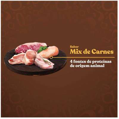 Contém quatro fontes de proteína de origem animal: frango, bovino, suíno e peixe.