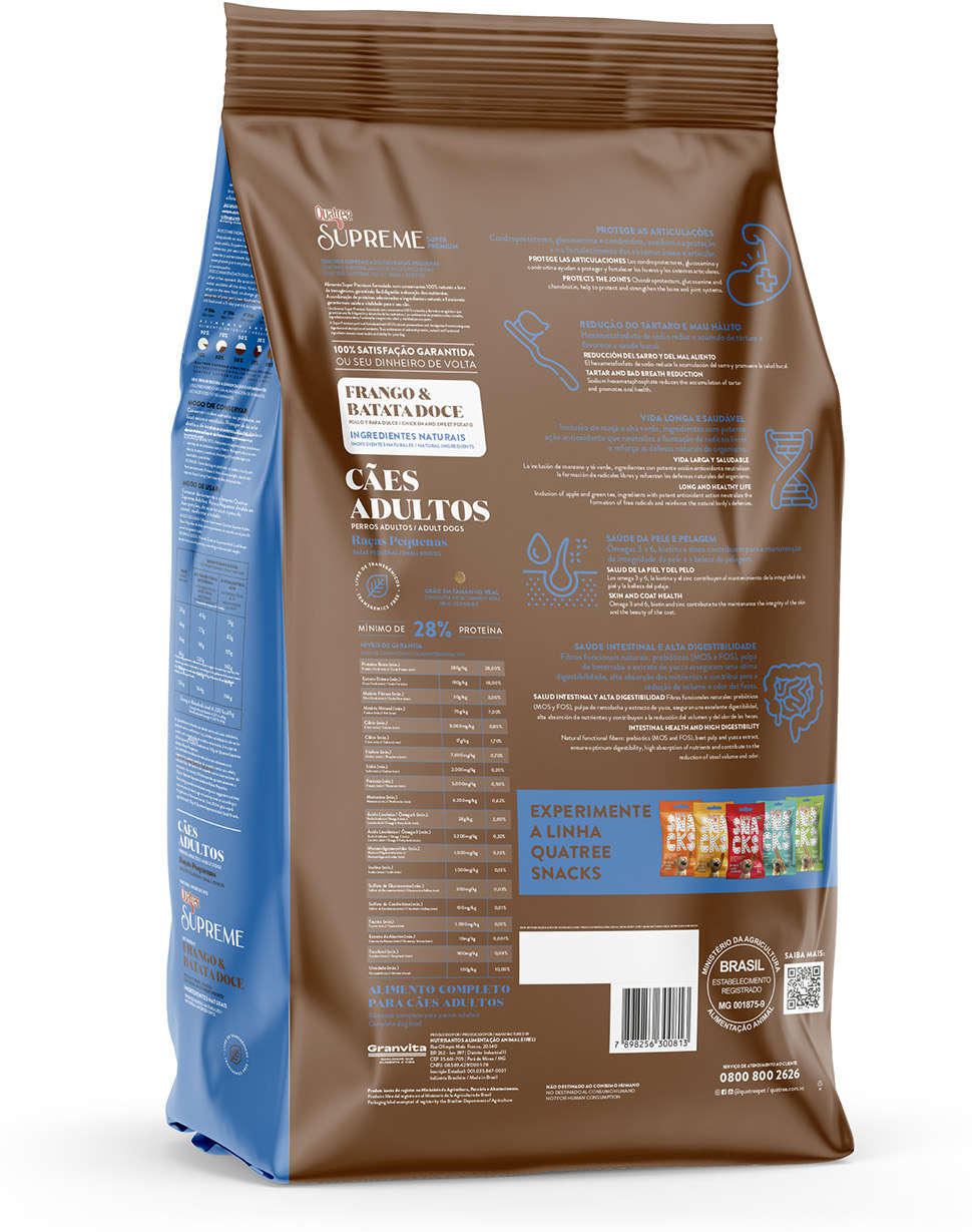 Características da Ração Quatree Supreme Adultos Raças Pequenas Sabor Frango e Batata Doce 1kg: